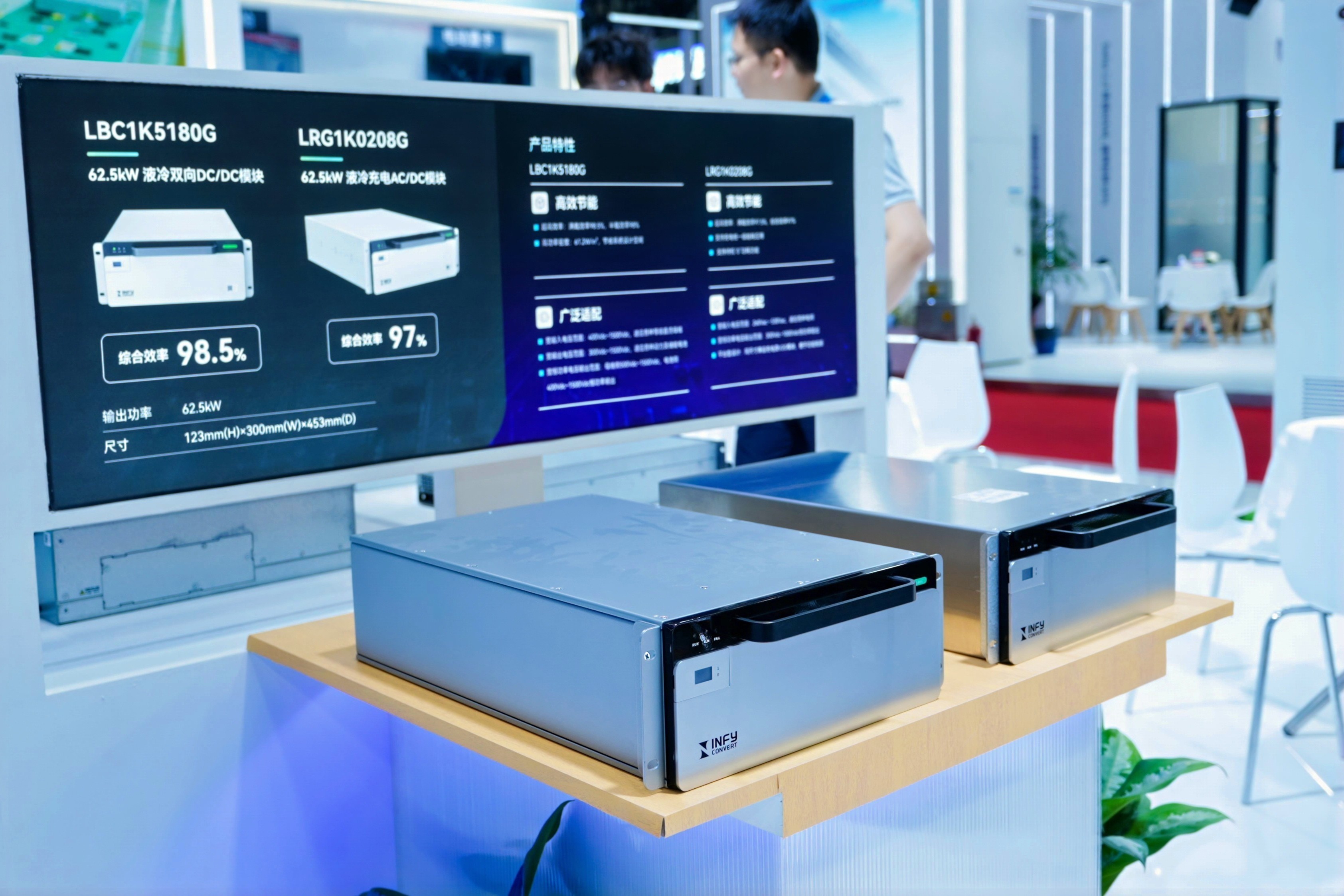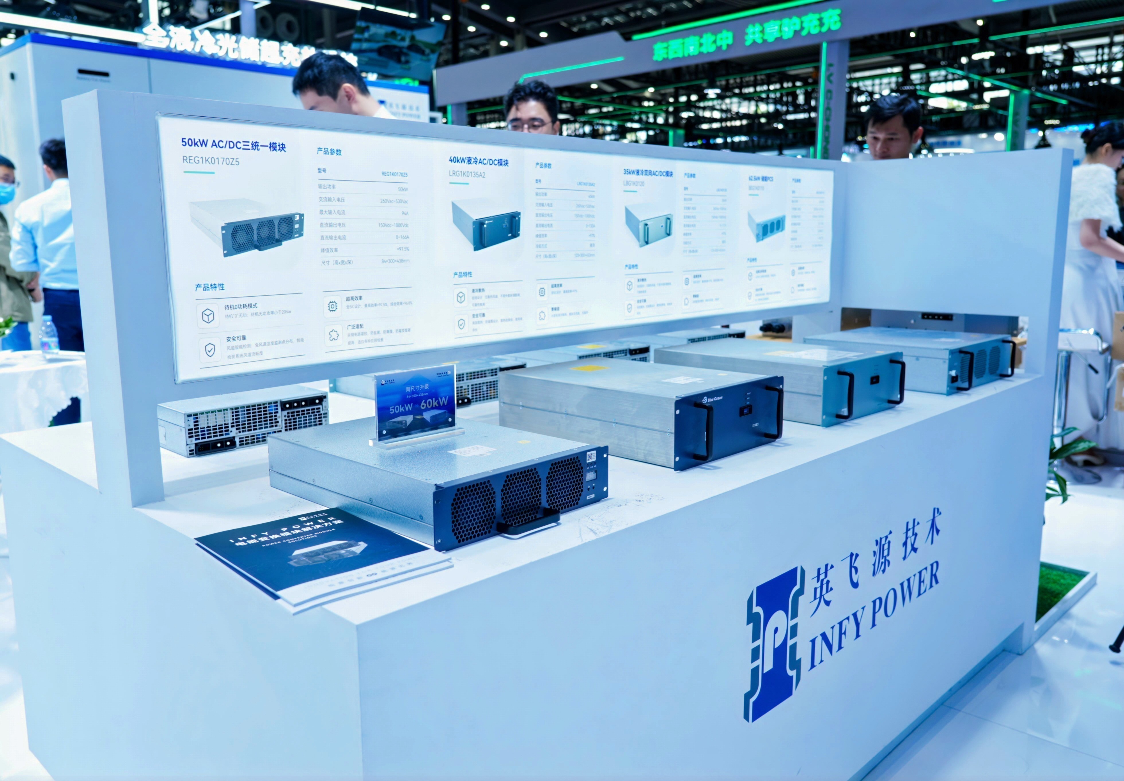 此次展會英飛源展示了62.5kW 液冷雙向 DC/DC 模塊、62.5kW液冷充電AC/DC模塊、50kW 高效率 AC/DC 模塊、30kW 雙向 AC/DC 模塊、35kW 液冷雙向 AC/DC 模塊等系列產品,從核心部件層面展現出其在充換電領域的技術深耕與創新底蘊。
