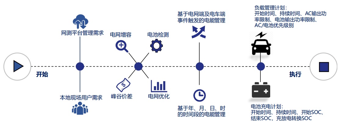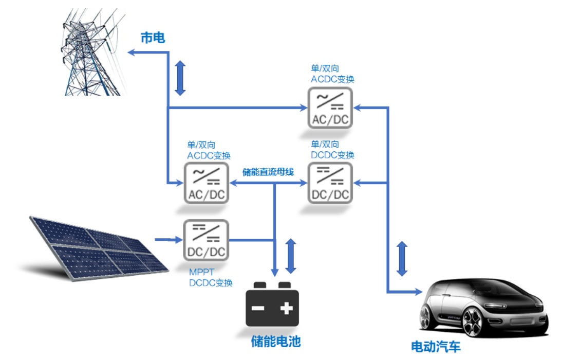 市電通過(guò)雙向AC/DC模塊給電動(dòng)汽車充電,同時(shí)電動(dòng)汽車的能量也可以逆變反饋給電網(wǎng),實(shí)現(xiàn)V2G;用電低谷時(shí)市電通過(guò)雙向AC/DC模塊給儲(chǔ)能電池充電,用電高峰期儲(chǔ)能電池則并網(wǎng)放電,實(shí)現(xiàn)削峰填谷;白天光伏組件通過(guò)DC/DC模塊給儲(chǔ)能電池充電,實(shí)現(xiàn)綠色能源的接入;儲(chǔ)能電池可以通過(guò)雙向DC/DC給電動(dòng)汽車充電,彌補(bǔ)市電容量的不足,減輕大功率充電對(duì)電網(wǎng)的壓力,同時(shí)電動(dòng)汽車也可將動(dòng)力電池的電能回饋給儲(chǔ)能電池存儲(chǔ)。